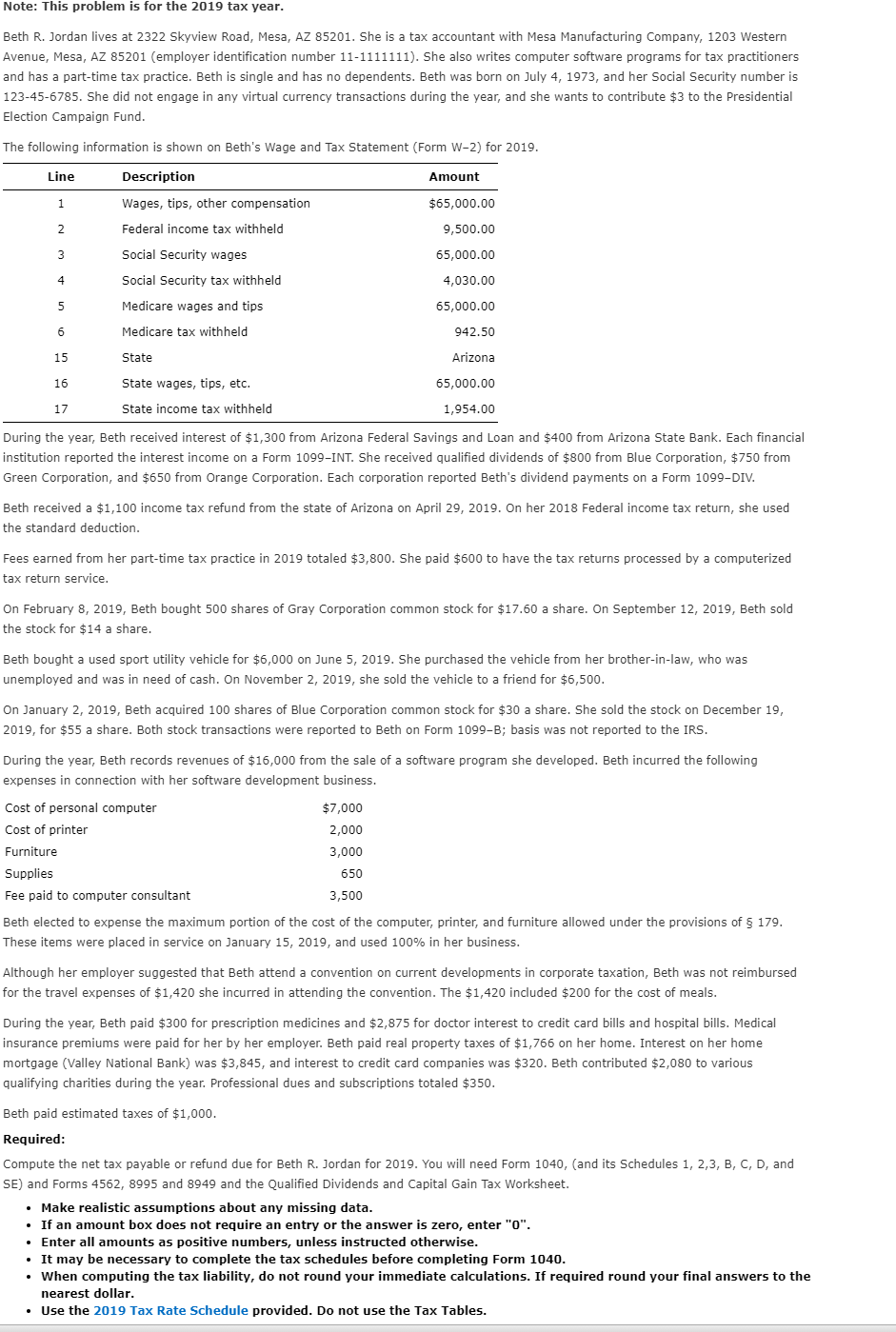 Note This Problem Is For The 2019 Tax Year Beth R Chegg Com